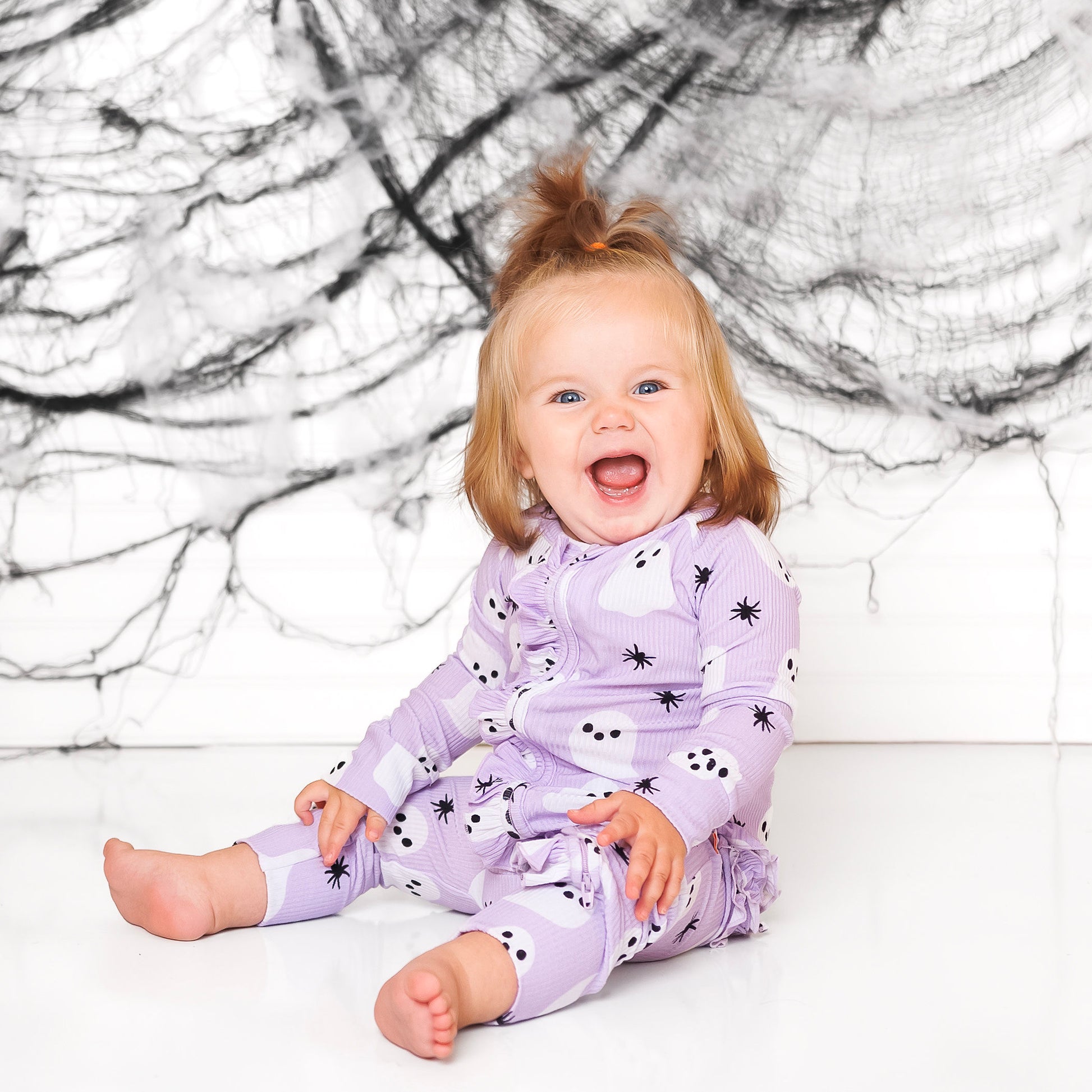 Scary Soft. Spooky Cute. Our Boo Buddies Zippy is perfect for all the little ghouls and goblins. Made with our signature buttery-soft, ribbed bamboo, this will keep kids cool, comfy, and ready for pumpkin patch adventures or spooky movie nights at home. Featuring a lavender base with playful ghosts + creepy-crawly spiders, plus a double zipper and fold-over cuffs for convenience.